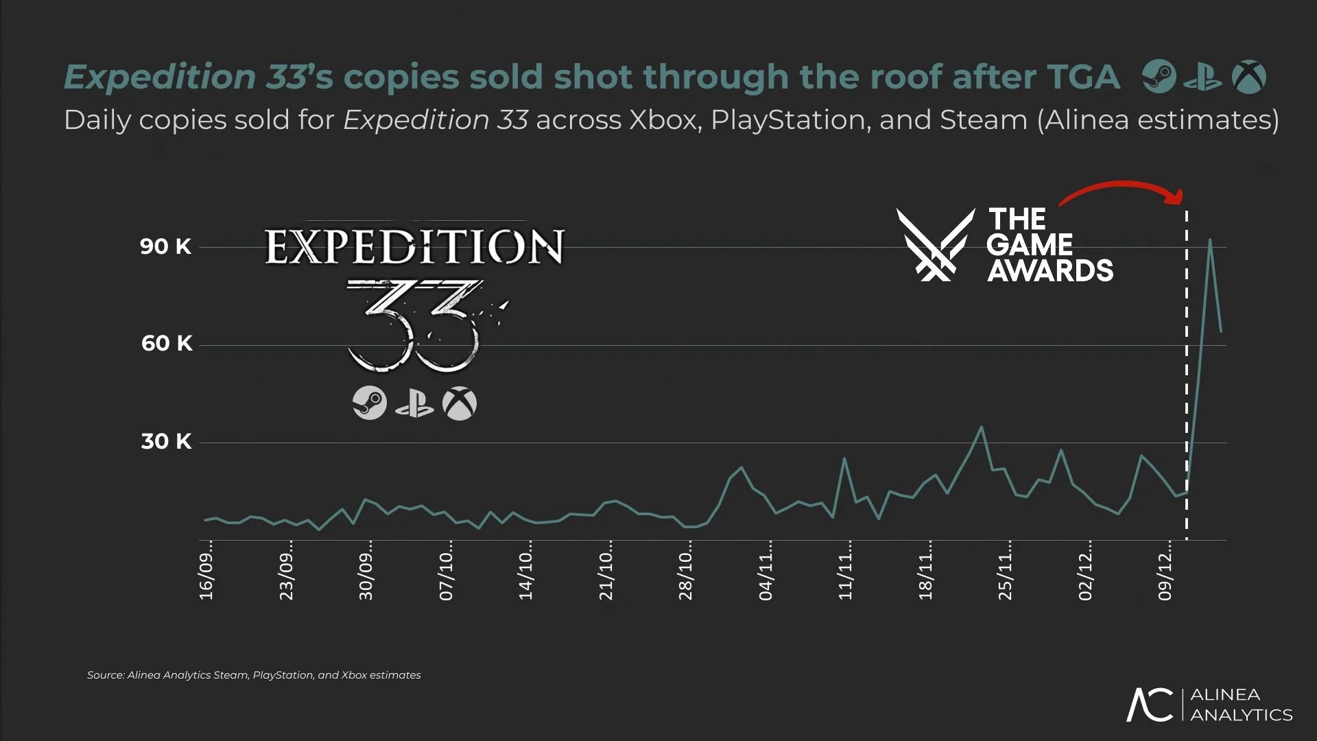 据市场分析机构Alinea Analytics报告,自TGA颁奖以来,《33号远征队》在全球范围内已新增超过20万份销量,其日平均销量暴涨近六倍。销售渠道数据显示,约76%的新增销量来自Steam平台,21%来自PS5,而Xbox平台仅占约3%。