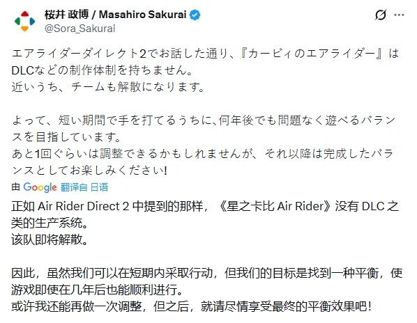 近日,知名游戏制作人樱井政博通过社交媒体宣布,其最新作品《星之卡比:飞天骑士》将不会推出任何DLC等追加内容,并且该游戏的开发团队也将在不久后解散。此消息在稍早前举行的“飞天骑士 Direct 2”活动中已有所披露。