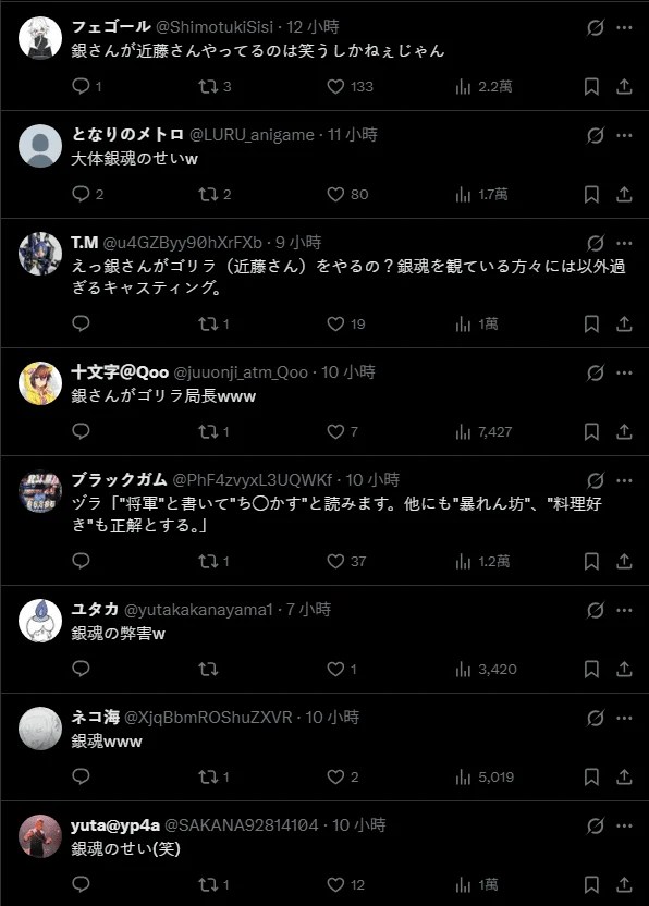 有网友直言“让银时配近藤先生,光听声音就想笑”,也有人惊呼“没想到银时要演大猩猩局长(《银魂》中对近藤勇的调侃称呼),这反差也太大了”,更有网友直接玩梗称呼其为“银时大猩猩局长”,评论区俨然变成《银魂》专场,满是熟悉的恶搞氛围。