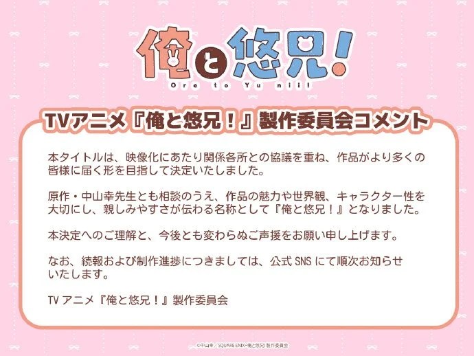 但考虑到动画化后,若继续使用该分类名作为作品名并大范围传播,可能会产生一些问题,最终决定将动画版标题定为《我和小悠哥!》。虽然漫画与动画的标题有所不同,或许会让一直以来支持本作的读者感到些许违和,但作品的内核是完全一致的,而且制作团队还会将它打磨成一部更加精彩的动画作品,衷心希望大家能够满怀期待!”
