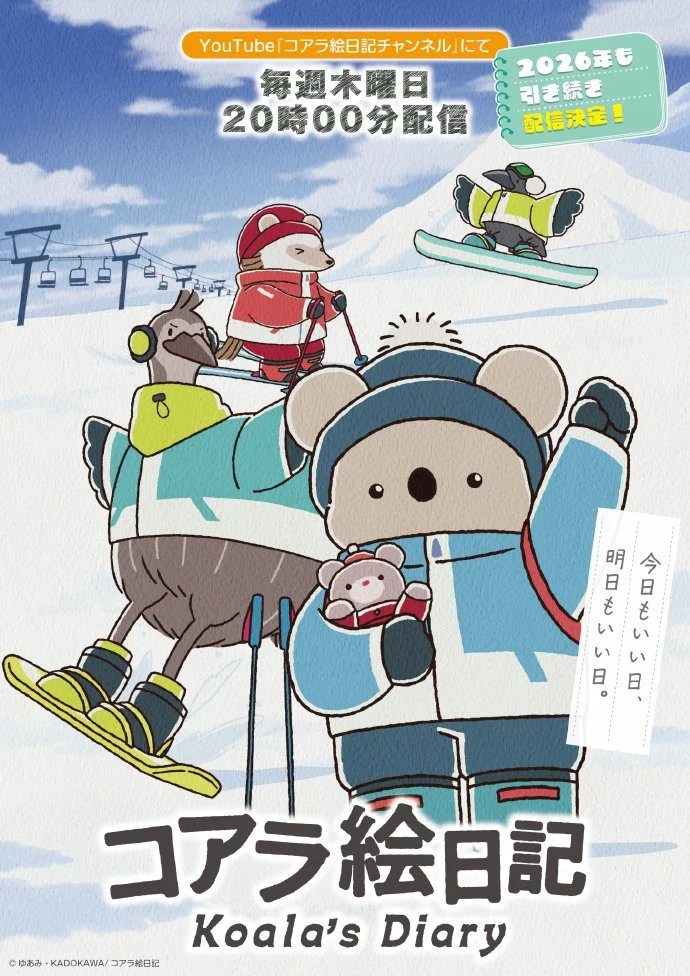 正在《考拉绘日记》动画频道连载的本作,讲述的是考拉温馨治愈的日常故事。2026年1月推出的vol.1,将于1月8日晚8点正式上线。由角色设计原千遥全新绘制的第二弹主视觉图,描绘出考拉、小熊和乌鸦其乐融融地享受滑雪乐趣的场景。此外,自1月起启用的主题曲,敲定为由噗尼噗尼电机feat.KanSano改编的《与彩虹相伴》摇摆乐版本。