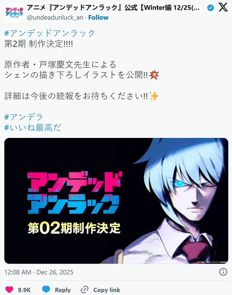 作为《周刊少年Jump》的人气佳作,《不死不幸》自2020年连载至2025年完结,全27卷单行本收获大批粉丝喜爱。此前于2023年10月至2024年3月推出的TV动画第一季,由David Production操刀制作,凭借紧凑带感的剧情、高水准的动画表现,成功圈粉无数,口碑爆棚。