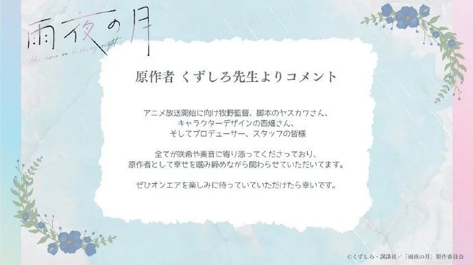 改编自くずしろ原作的TV动画《雨夜之月》,先导视觉图与制作团队信息已正式公开。