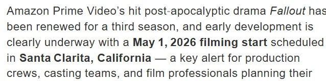 ·据悉,《辐射》真人剧第三季5月1日于加利福尼亚州的圣塔克拉利塔开拍,导演、编剧以及主演等阵容依然延续第二季,敬请期待。