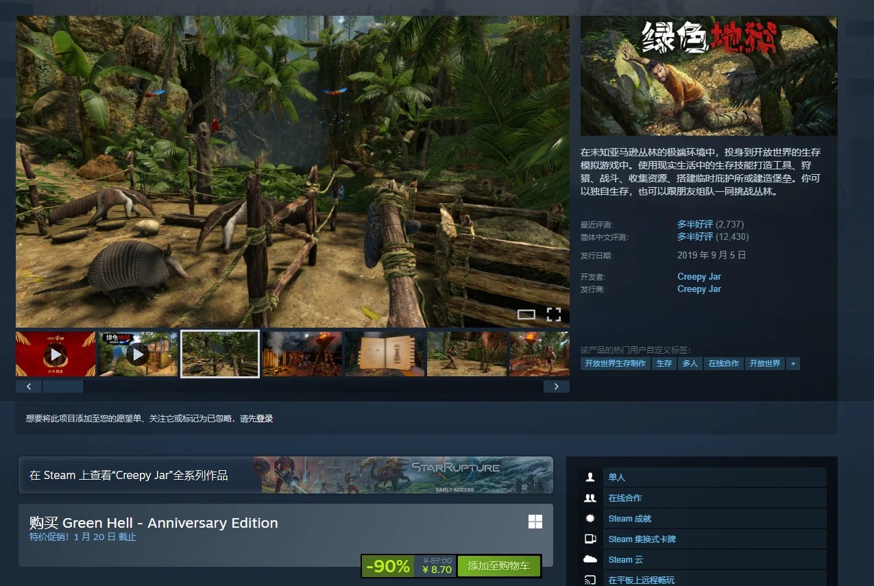 值得注意的是,玩家可以以低至一折的史低价购买《绿色地狱》的周年纪念版,仅需8.7元,截止至1月20日。