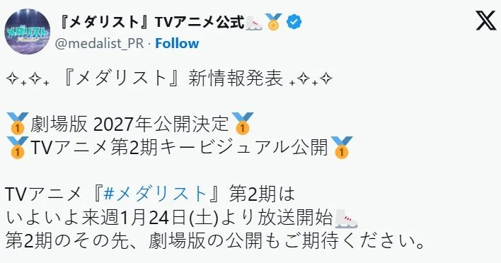 1月17日,官方正式发布重磅消息:《金牌得主》剧场版制作决定,同时公开了即将开播的TV动画第二季主视觉图。据悉,这部剧场版将承接1月24日上线的第二季动画后续剧情,预计于2027年正式上映。