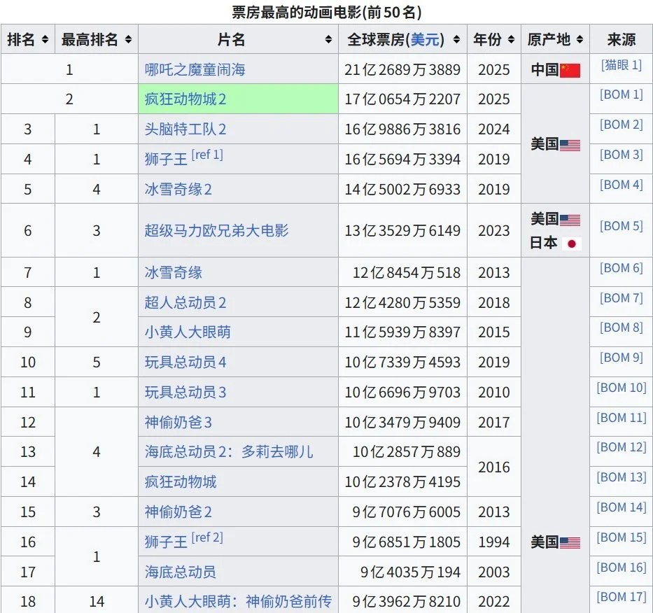 「疯狂动物城2」登上全球动画电影票房第二的宝座