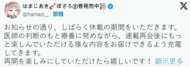 人气漫画《孤独摇滚!》于18日晚间传来休刊消息,官方公告称,此次休刊系作者滨路晶(はまじあき)身体状况不佳所致,为保障作者健康,编辑部决定让其延长休养时间,恢复连载的具体日期将另行通知。