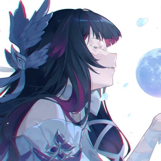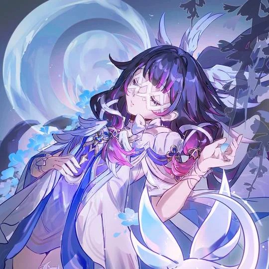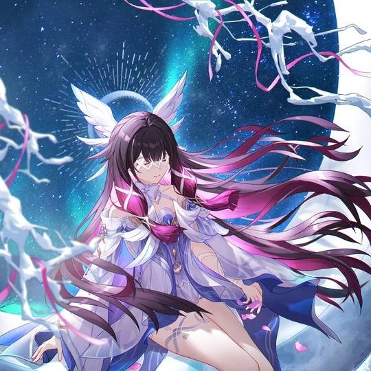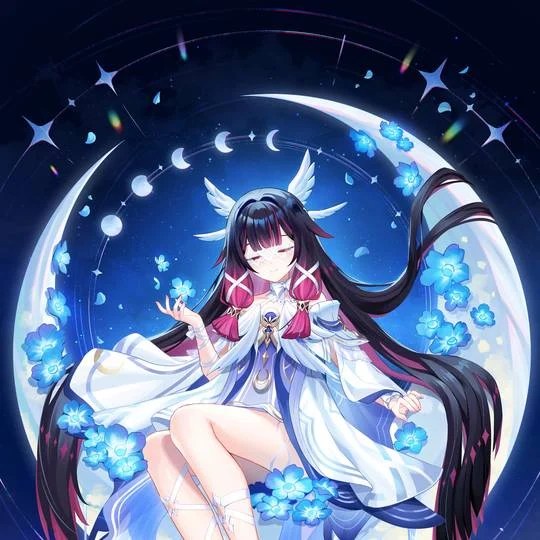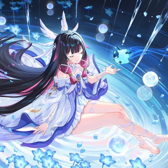 深姜红色挑染的黑发少女,脸上戴有白色网格状面纱,后脑处佩戴六翼翅膀头饰,穿戴白蓝相间的月神服饰,赤脚,手腕和腿部缠有白色蝴蝶结丝绸作为装饰,脚底附有水珠和月牙形态的高跟底座,常以闭眼姿态示人。