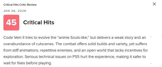 《噬血代码2》试图进化“二次元类魂”这一定位,但剧情表现乏力,过量的过场动画反而拖慢了节奏。战斗系统在配装构筑和玩法多样性上仍有亮点,却受限于生硬的动作演出、重复度偏高的敌人设计,以及缺乏探索动力的开放世界。PS5版存在较为严重的技术问题,明显影响整体体验,更稳妥的选择或许是等待后续修复后再入手。