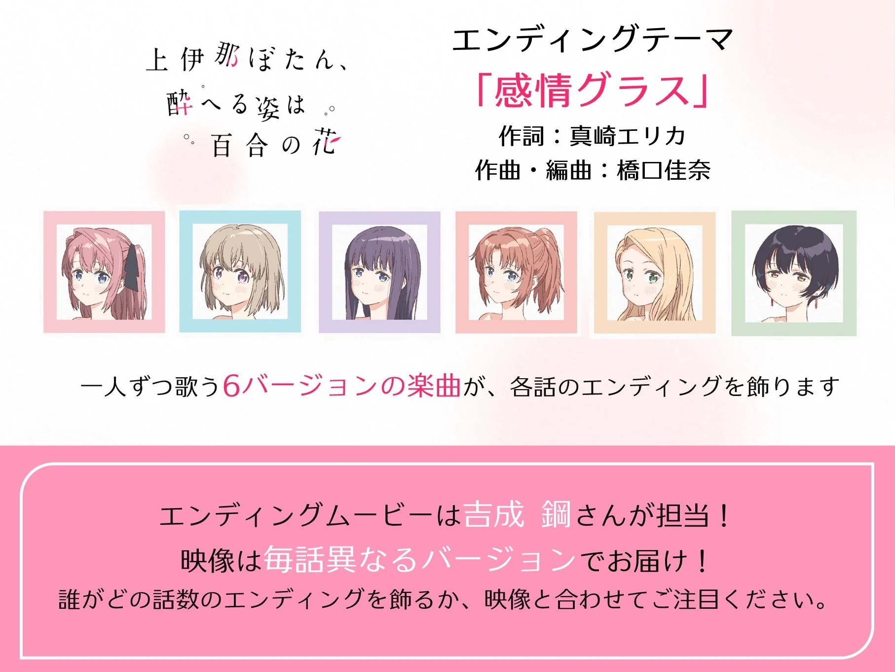 这番的ED挺有意思,片尾曲由6位主要角色各演唱一个版本,而且片尾影像都是吉成钢负责的。听起来就很有看头!