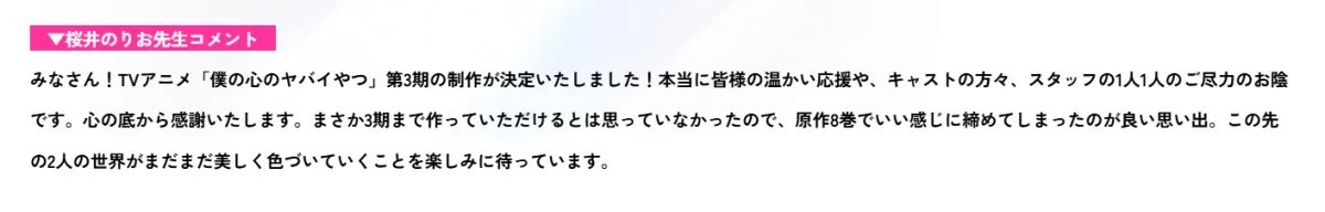 原作者樱井纪雄也送来暖心寄语:“《我心里危险的东西》第三季动画确定制作!由衷感谢大家一如既往的温暖支持,感谢声优及制作团队的每一位伙伴。说实话,我当初完全没想过这部作品能做到第三季,原作第8集时其实已将故事画上圆满句号(笑),如今回想起来,真是有趣的缘分。今后两人的世界还将继续慢慢延伸,作为作者,我同样充满期待。”