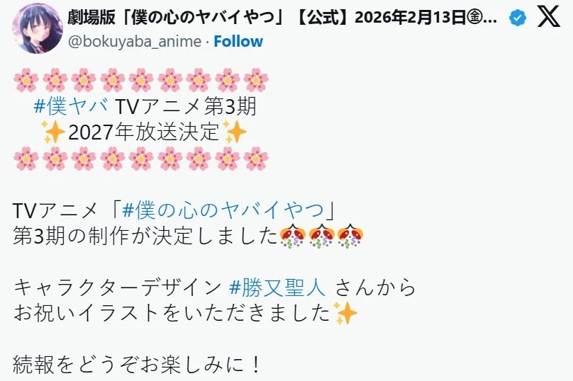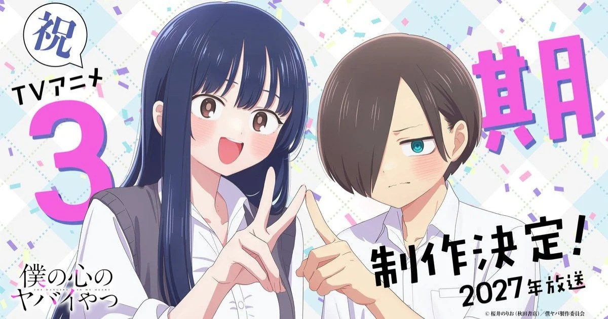 由樱井纪雄创作的漫画《我心里危险的东西》迎来动画化新篇章。3月14日官方正式宣布,该作第三季TV动画已确定制作,预计于2027年与观众见面。为纪念这一消息,角色设计胜又圣人精心绘制的贺图同步公开。