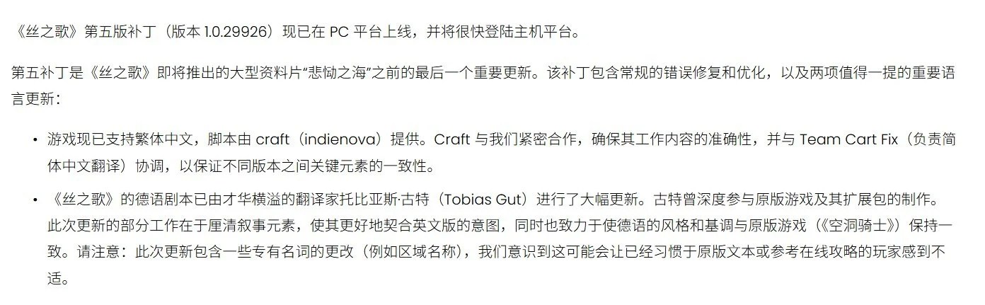 本次补丁依旧是关于常规的漏洞修复和优化,而更新的重点在于更新主要语言的本地化。一个是繁体中文,而另一个是德语。繁体中文这边樱桃社请到了资深本土化团队,并邀请了为本作修复完善简体中文翻译的修车组进行文本的协调,保证关键元素在版本间的一致,为我国港澳台玩家提供更顺畅的游戏体验。