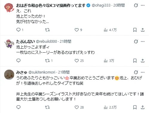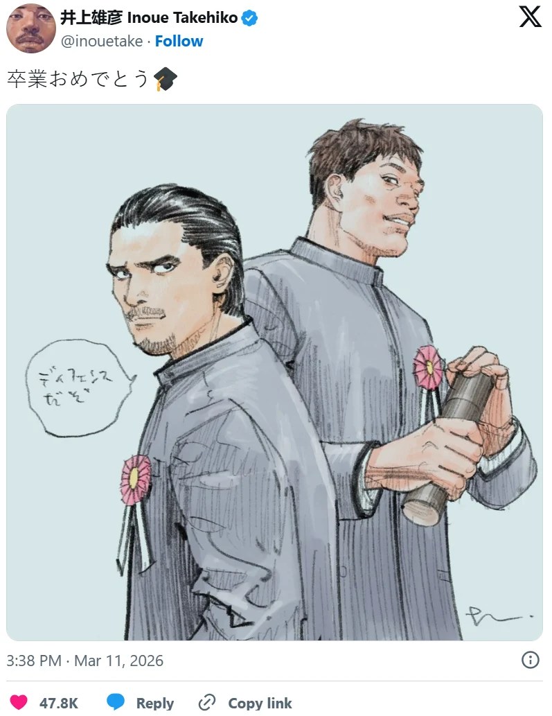 无论如何,这张毕业贺图依然收获无数好评。对《灌篮高手》的爱好者而言,能看到井上老师动笔描绘这些角色,本身就是一种幸福。这也是井上每年毕业季的惯例——而下次他会画哪个人物的毕业模样,同样令人期待。