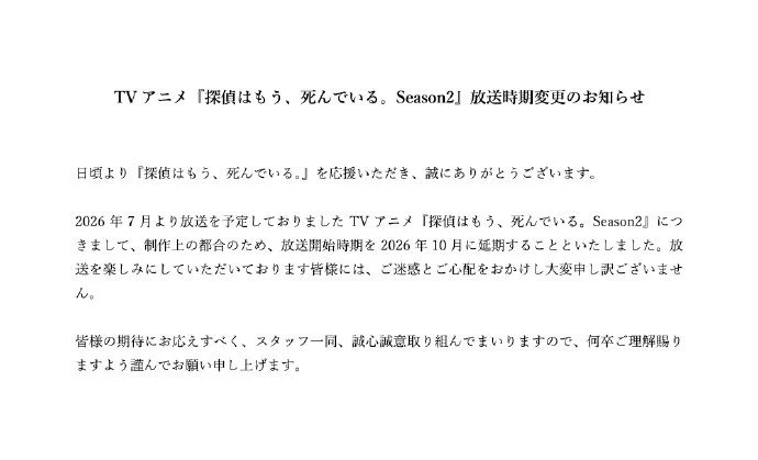 《侦探已死》官方X账号解释称,延期是“由于制作上的原因”,并写道:“给大家带来不便和担心,我们深表歉意。为了回应大家的期待,全体工作人员将真诚努力,恳请各位予以理解。”