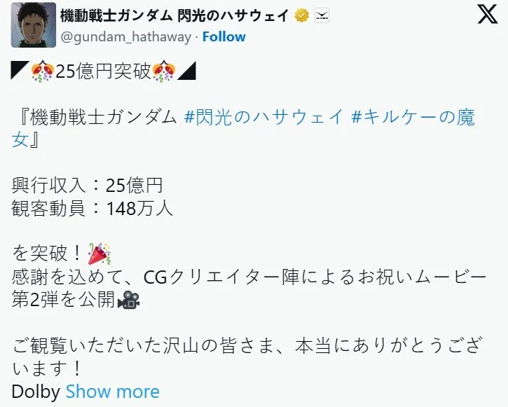放眼整个《高达》系列电影,目前票房冠军仍由2024年1月上映的《机动战士高达 SEED FREEDOM》以超过50亿日元的成绩牢牢占据,亚军则是票房约35亿日元的《机动战士高达GQuuuuuuX -Beginning-》。如今《喀耳刻的魔女》的强势表现,也让其能否进一步挑战35亿大关备受期待。