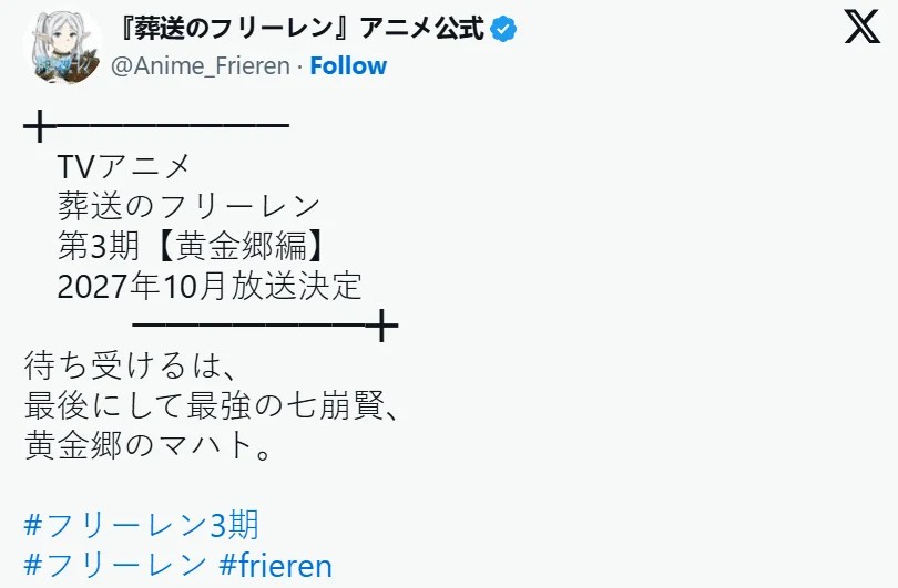 对于一路追来的观众而言,“黄金乡篇”几乎是自第一季开播以来便始终高悬于心的期待。而第二季的结尾,恰好停在了这段旅程的起点——那是风雨将至前最后的宁静,也是一切真正展开的前奏。即便2027年10月看似遥远,但以《葬送的芙莉莲》前两季所积累的信任与口碑,这段等待,反而成了一种值得珍惜的余韵。