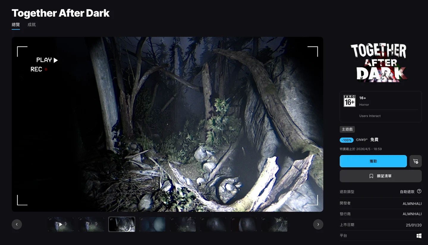 由 RedForge 发行并开发的合作型心理恐怖游戏《Together After Dark》现已在 Epic 游戏商城开启限时免费领取“喜加一”活动,游戏在国区定价为 9 元,玩家可以在 4 月 5 日 17:59 前领取本作。