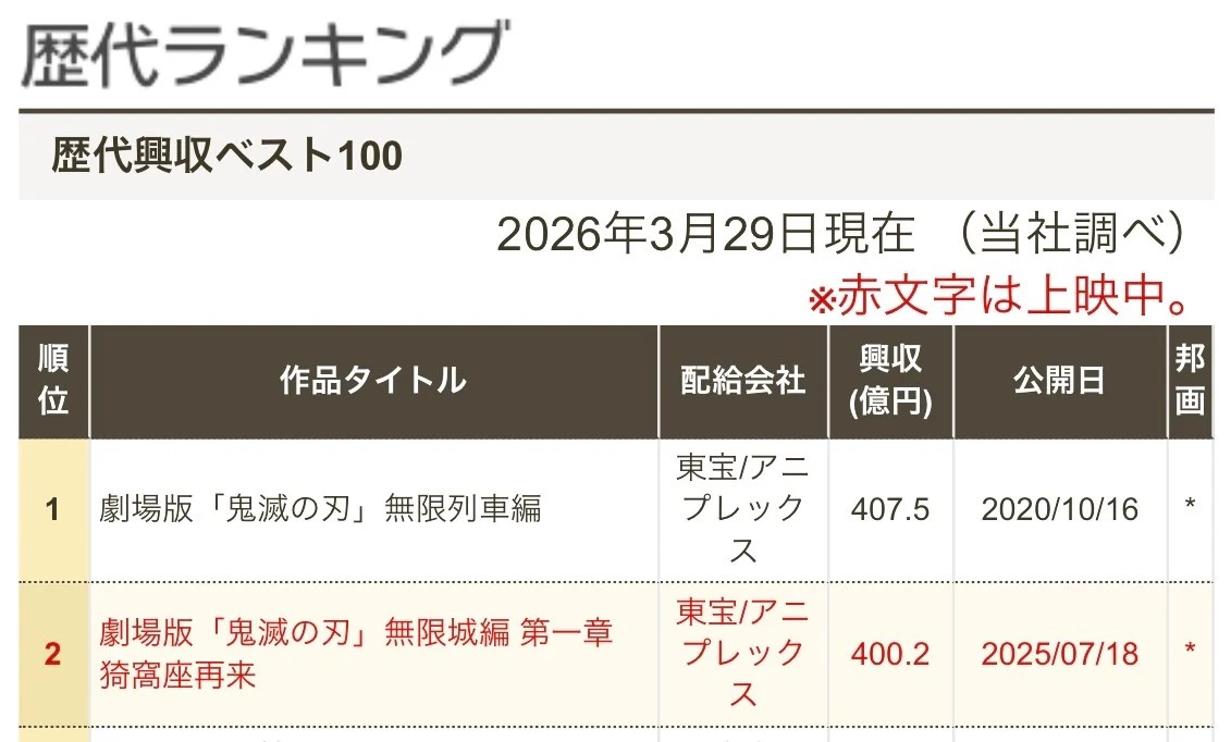 值得玩味的是,两部《鬼灭》剧场版双双突破400亿日元,意味着日本影史仅有的两部“400亿级电影”全部由《鬼灭之刃》包揽。而相较于《无限列车篇》在国内市场的现象级爆发,《无限城篇 第一章》更将影响力扩展至全球,进一步巩固了《鬼灭》作为跨文化IP的地位。